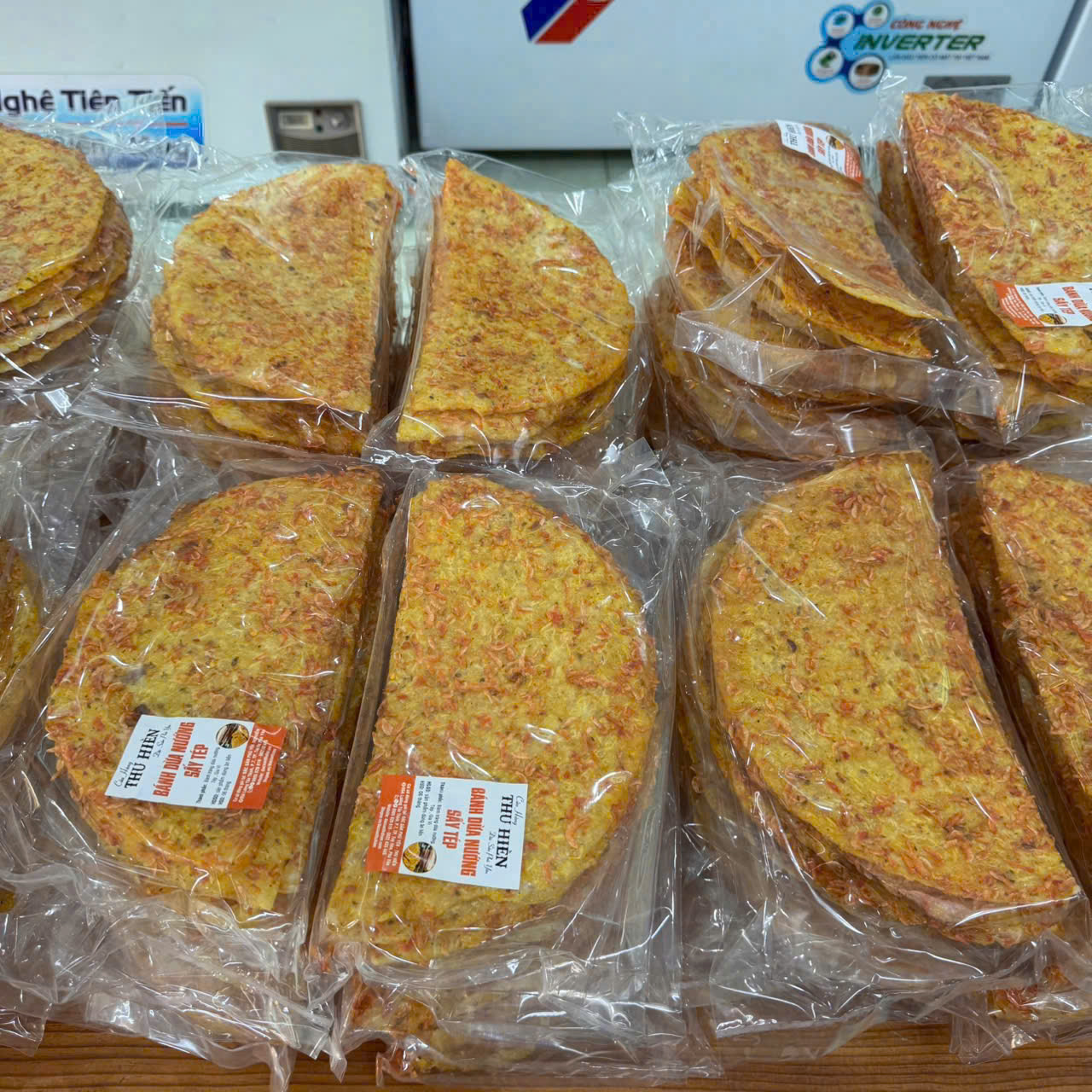 Nguyên liệu: Bánh tráng nước dừa được nướng lên rồi sấy cùng gia vị với tép. Bánh giòn, gia vị vừa ăn, thơm, béo